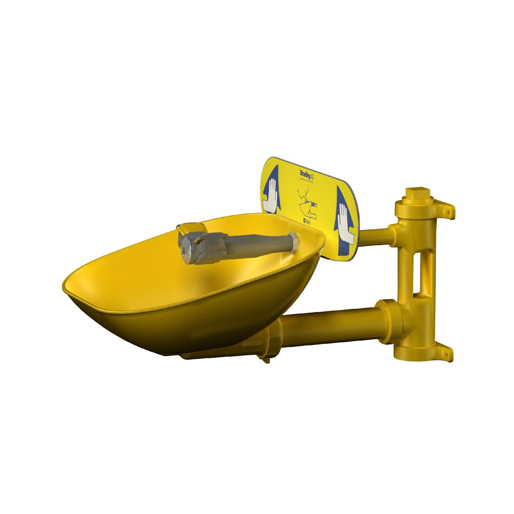 Acero galvanizado protegido con recubrimiento de seguridad amarillo BRADTECT. Diseño sin obstáculos, totalmente accesible para personas con discapacidades físicas. Incluye letrero de identificación universal y rótulo de inspección. El lavaojos supera el flujo de agua mínimo de 0,4 GPM a 30 PSI. El único diseño de drenaje automático de la industria: The Aquaduct™. Tuberías de suministro y desagüe separadas: cumple con los requisitos de CEN y de plomería. Pala ergonómica lavaojos de activación manual: fácil de alcanzar desde cualquier dirección. Lavaojos completamente ensamblado y probado en fábrica.